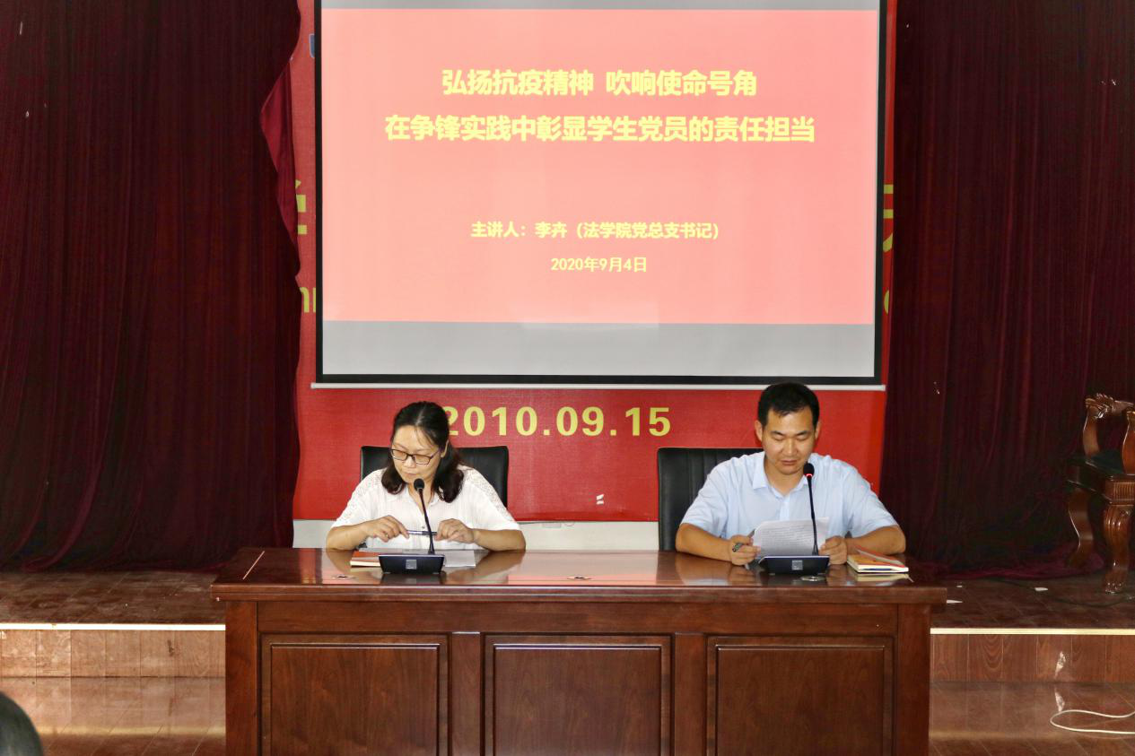 为庆祝中国共产党成立99周年及建校70周年,提高学生党员思想觉悟,贯彻落实学校党委“我来讲党课”活动要求,9月4日下午,法学院学生党支部在模拟法庭举办“弘扬抗疫精神 吹响使命号角——在争锋实践中彰显青年学生党员的责任担当”主题党日活动。法学院党总支书记李卉、党总支副书记刘俊杰、学生党支部全体党员参加了活动。