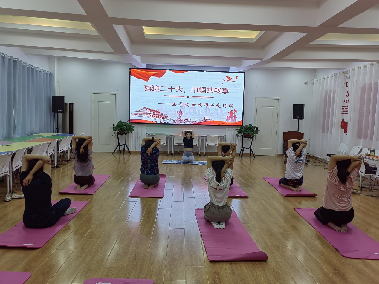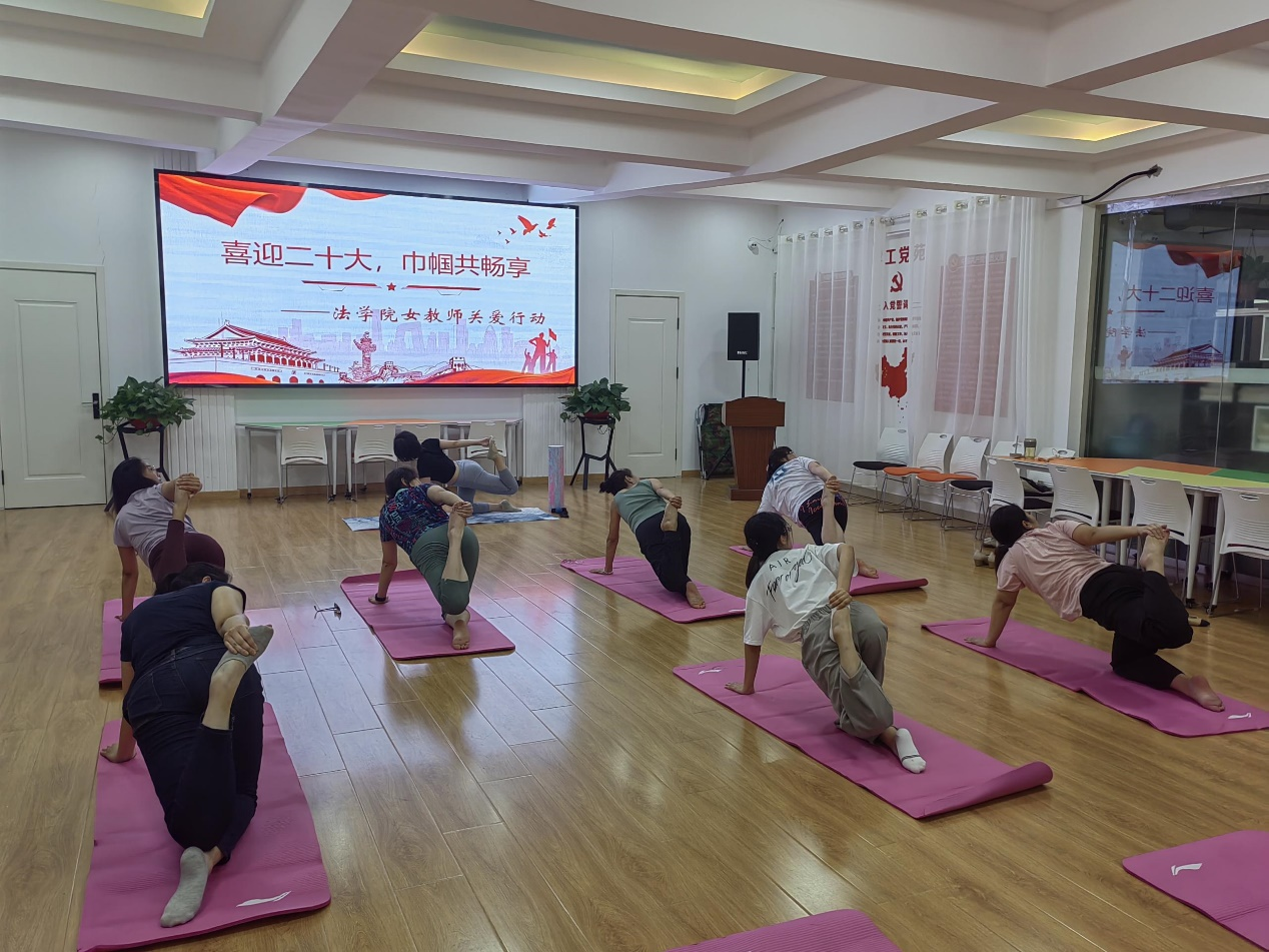行动之二:女教职工们在法律系田源老师的带领下进行瑜伽体验。通过四十分钟的舒缓活动,缓解了一天的疲惫,大家一起享受放松、舒适的身心状态。