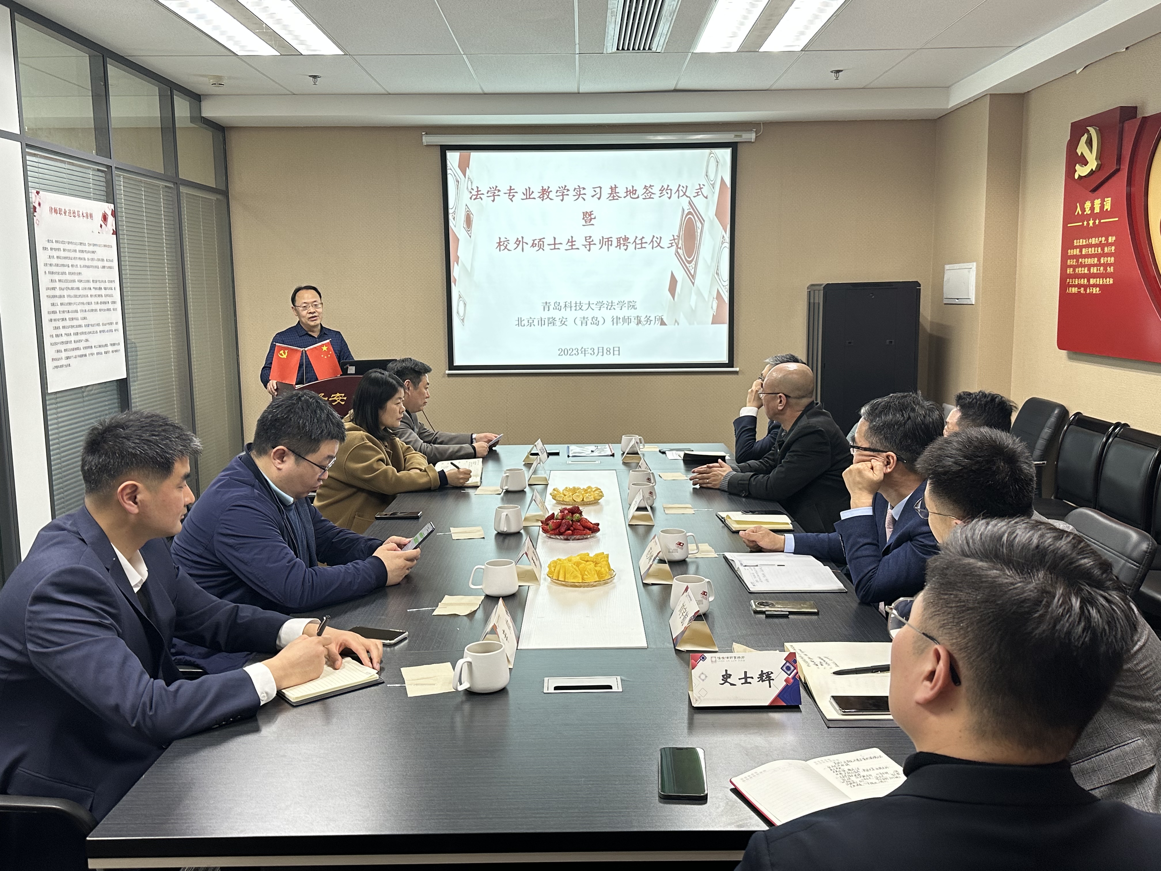 3月8日下午,青岛科技大学法学院与北京市隆安(青岛)律师事务所共建法学专业实践教学基地签约仪式暨校外硕士生导师聘任仪式在隆安青岛律师事务所会议室举行。法学院院长王金堂、党总支副书记兼副院长王祥梅、法律系主任兼院长助理綦磊、经济法教研室主任辛帅,隆安青岛律师事务所党支部书记、主任于鸿章及执行主任焦成龙等参加仪式。