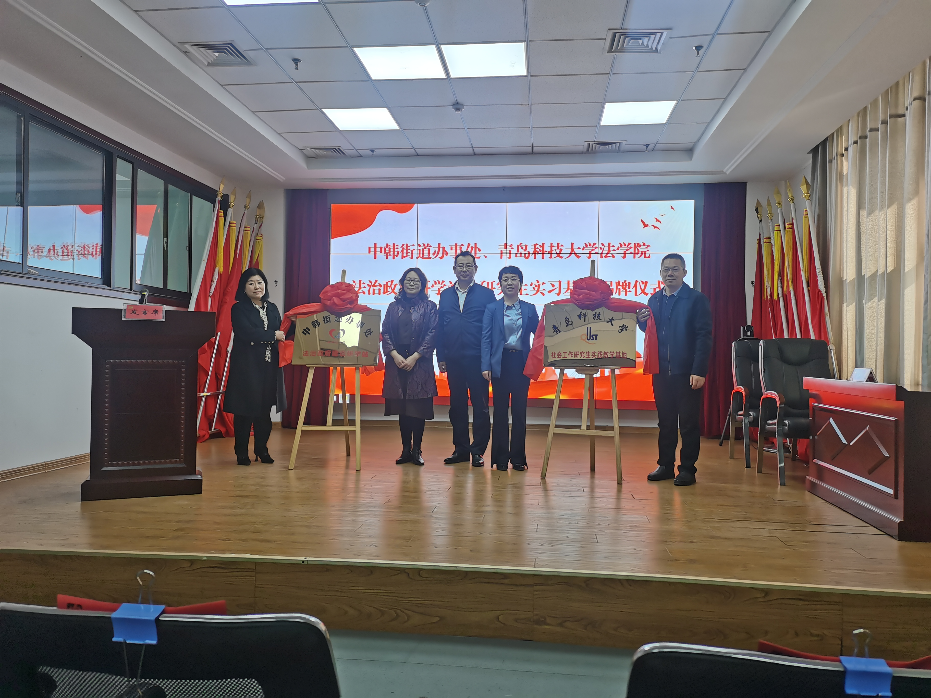 随后,法学院副院长陈为智与中韩街道办事处党工委副书记卢立庆现场签订了合作协议;高洁、王东海,吴晓娟,李卉,陈为智等为实习基地揭牌。