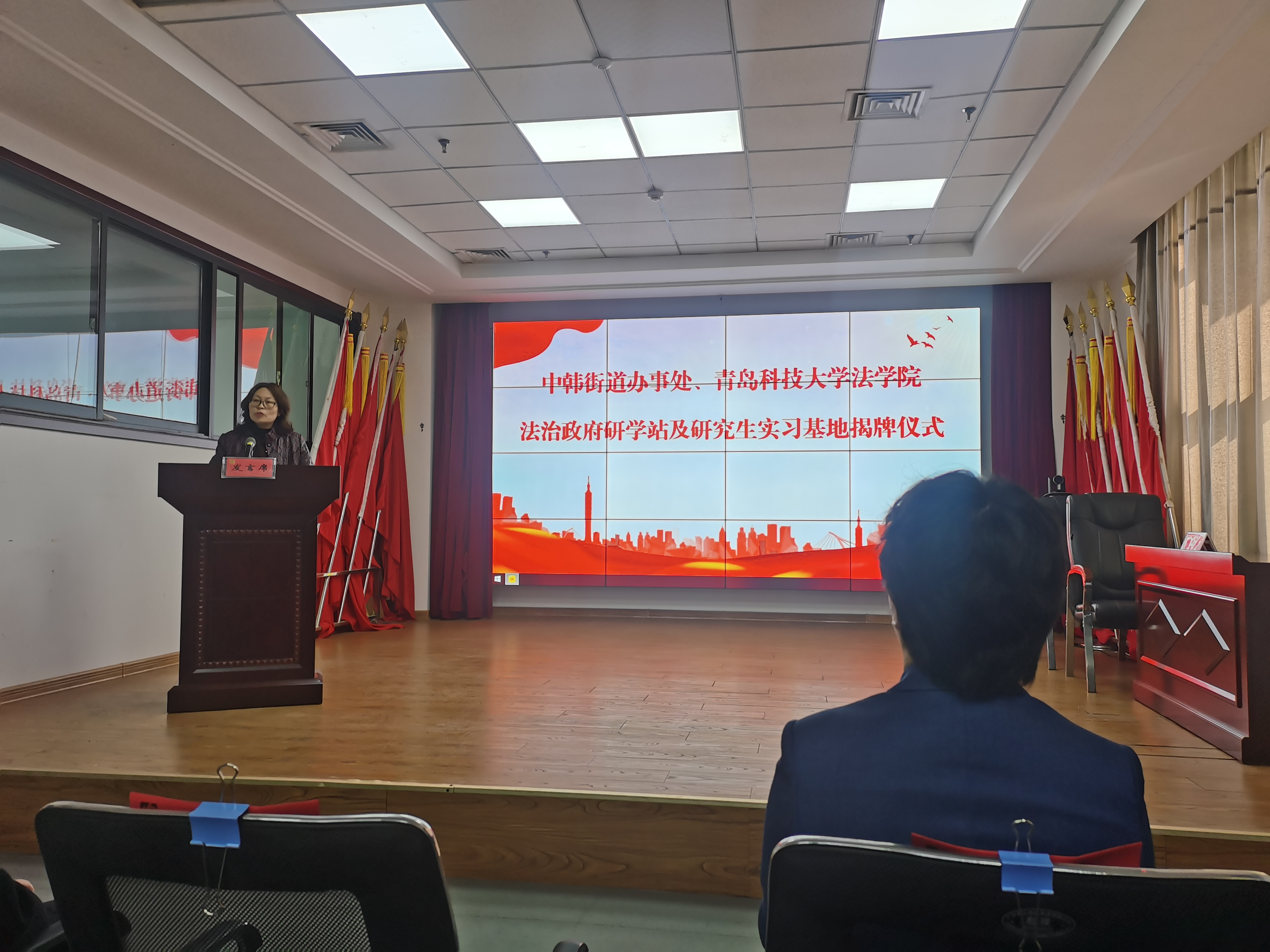 仪式首先由双方领导致辞,中韩街道办事处党工委副书记王东海指出,在提升基层治理能力现代化水平和推进基层法治政府建设的背景下,希望双方借此契机,依托各自优势进一步深化合作,开拓出互惠共赢共同发展的新路子。法学院党总支书记李卉指出:双方共建法治政府研学站,是深入学习贯彻习近平法治思想推进法治政府和法治社会建设的具体行动,是更好服务保障高质量发展和现代化建设的有效举措,研学站为法学院教师提供了服务地方、回报社会的高质量平台。社会工作研究生实习基地为法学院的研究生搭建了了解基层、历练专业本领、服务社会的良好平台。学院师生将发挥专业优势,为辖区内群众贡献青科大的智慧和力量。