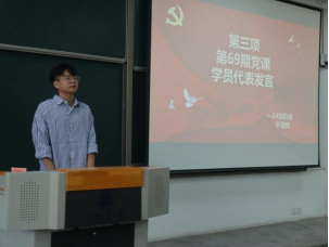 69期党课培训班学员于朋辉作为新一期学员代表进行发言。他谈到要认真学习党的理论知识,深入了解党的历史和优良传统,坚定对党的信仰和忠诚。作为积极分子,要勇于担当作为,不断提高自身素养,以实际行动争取早日加入中国共产党。