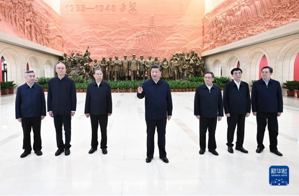 10月27日,中共中央总书记、国家主席、中央军委主席习近平带领中共中央政治局常委李强、赵乐际、王沪宁、蔡奇、丁薛祥、李希,瞻仰延安革命纪念地。这是习近平等在延安革命纪念馆,参观《伟大历程——中共中央在延安十三年历史陈列》。 新华社记者 燕雁 摄