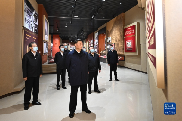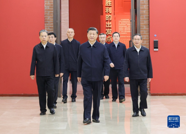 10月27日,中共中央总书记、国家主席、中央军委主席习近平带领中共中央政治局常委李强、赵乐际、王沪宁、蔡奇、丁薛祥、李希,瞻仰延安革命纪念地。这是习近平等在延安革命纪念馆,参观《伟大历程——中共中央在延安十三年历史陈列》。 新华社记者 王晔 摄
