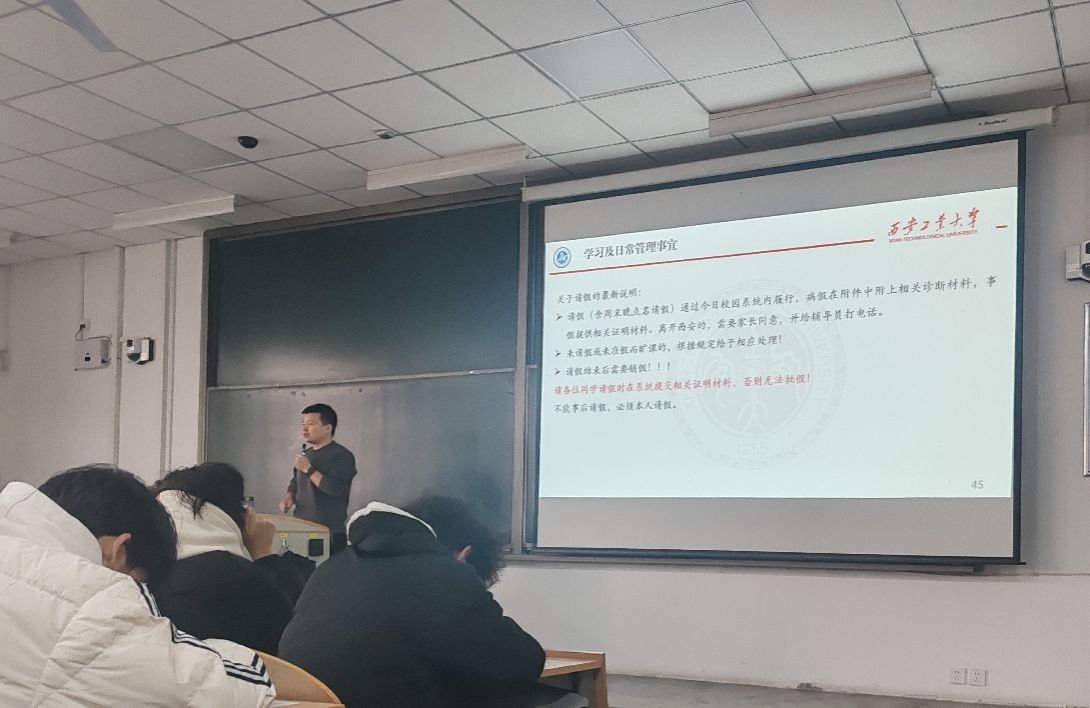 最后,刘冬针对学习及日常管理事宜进行说明,重点解读请假制度的要求,明确请假需通过校园系统履行流程并附相关证明材料,严禁未请假缺课、事后补假等行为,同时对课堂纪律、日常考勤等管理细则再次强调,督促同学们遵守校纪校规,规范日常学习生活。