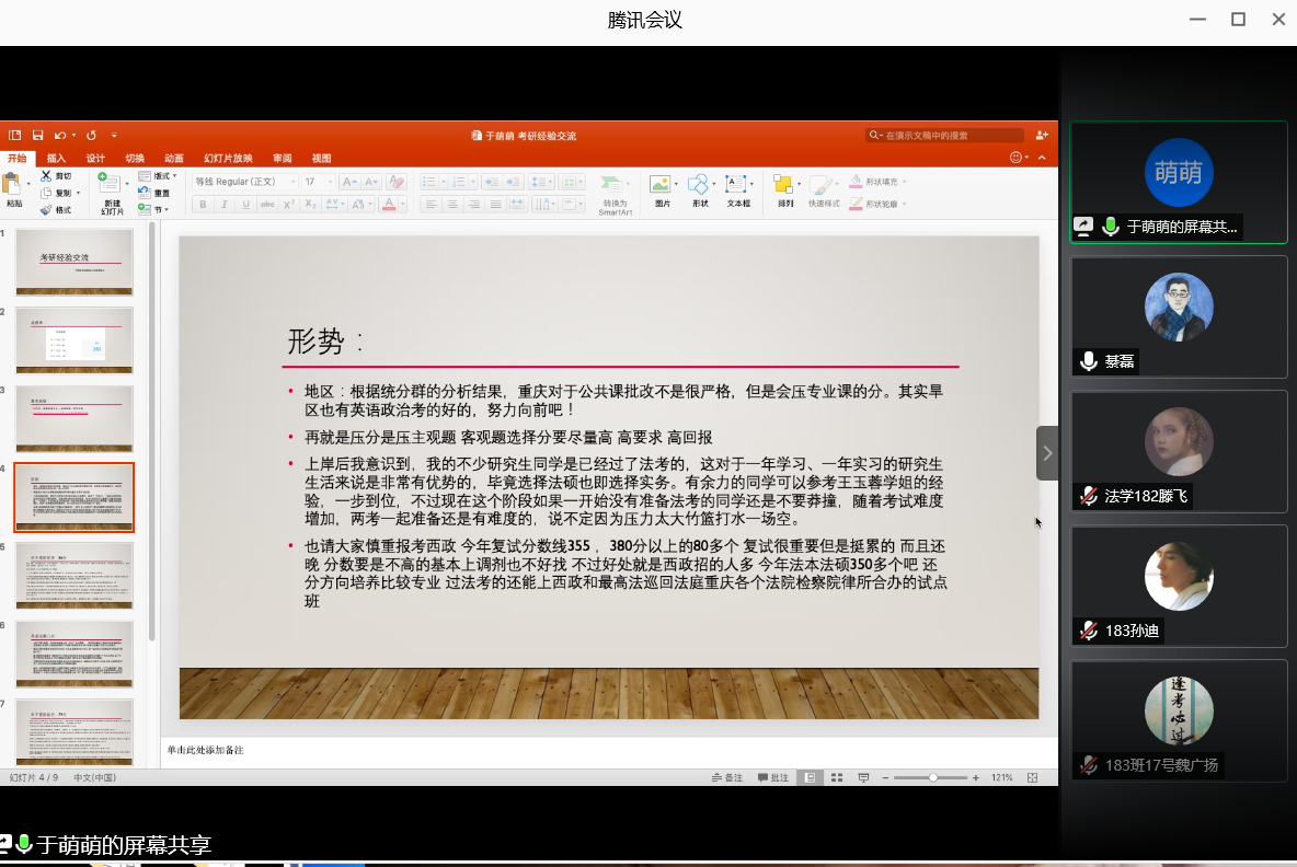 交流会分为经验分享和自由交流两个环节。在经验分享环节,被保送至华东政法大学的于畅同学和李丹丹同学、考取中国政法大学的周筱涵同学、考取华东政法大学的王雨晨同学、考取西南政法大学的于萌萌同学、考取暨南大学的王新月同学、考取烟台大学的向文轩和闫丽丽同学、考取大连海事大学的杨晓玉同学、考取中国海洋大学王玉蓉同学、考取青岛科技大的李奕萱和李凯同学,围绕着公共课、法律硕士和法学硕士的初始和面试环节分享经验。在自由交流环节,同学们围绕着英语备考、时政热点、不同高校法学硕士的题型与知识重点等方面进行交流。