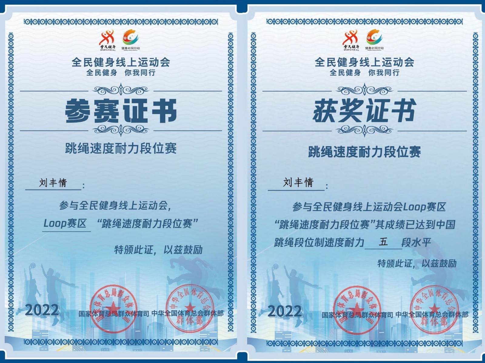 此外,在全民健身线上运动会跳绳速度耐力段位赛中,刘丰情还获得了Loop赛区中国跳绳段位制速度耐力五段水平。