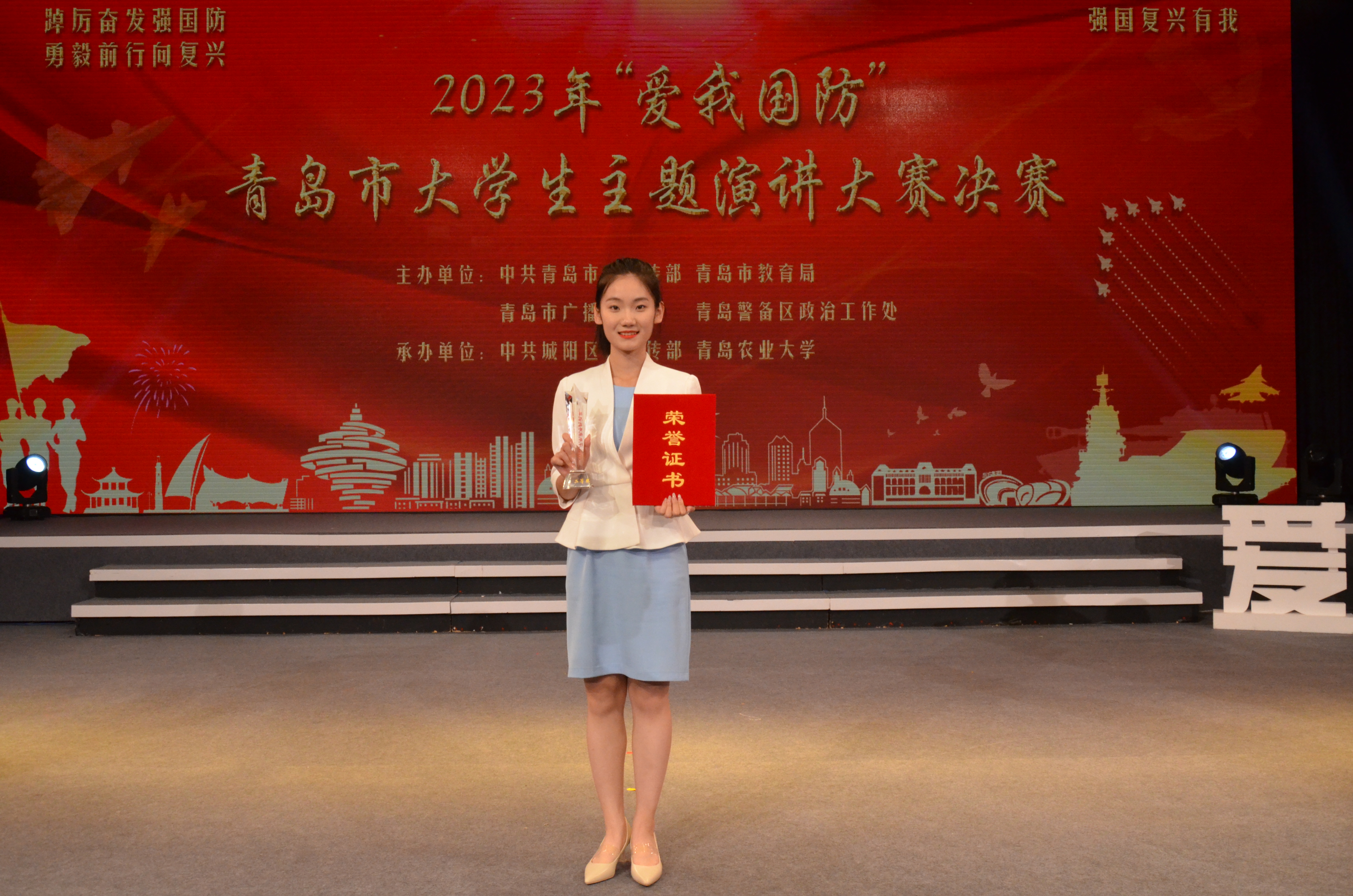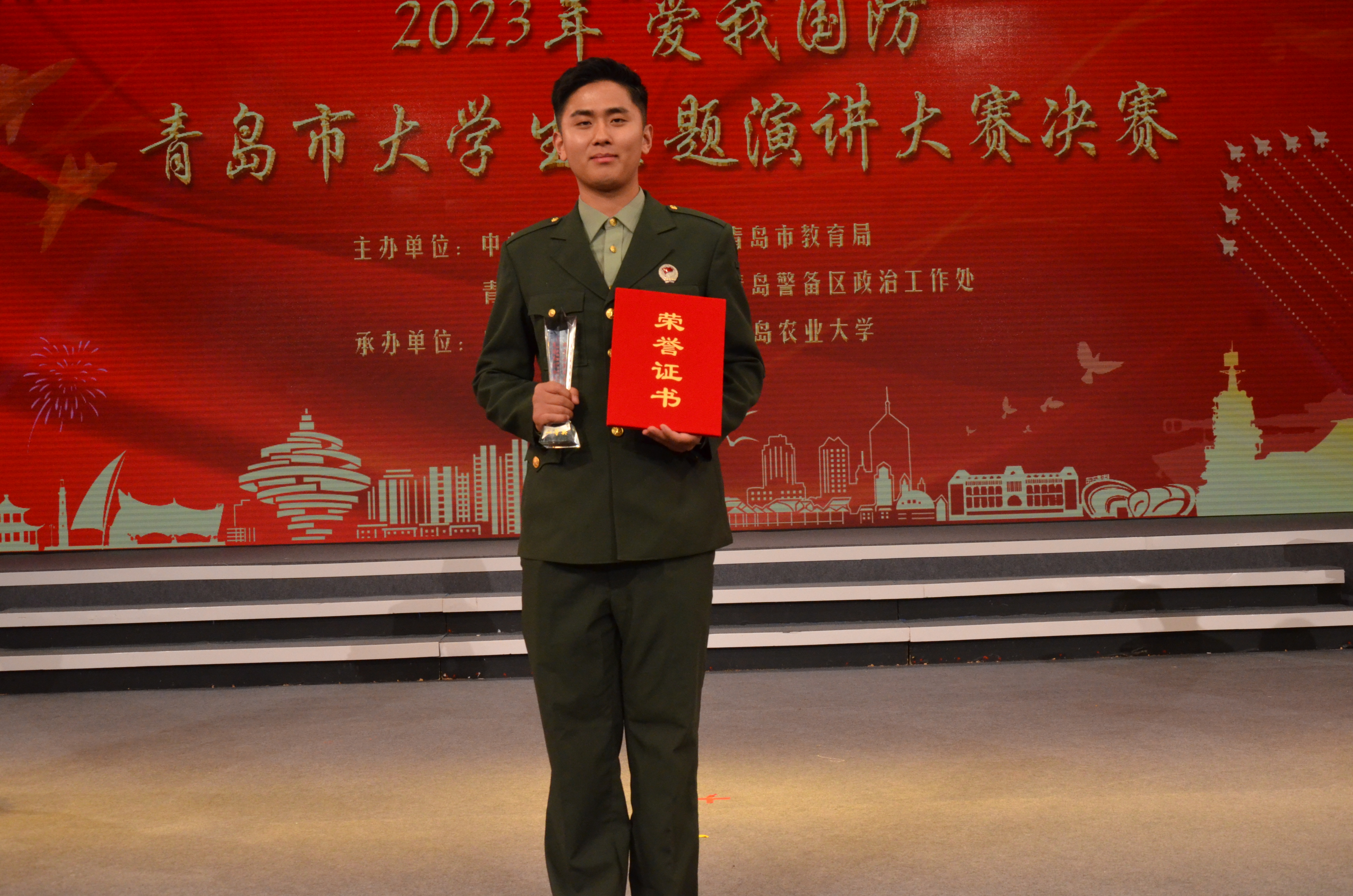 在刚刚落幕的2023年“爱我国防”青岛市大学生主题演讲大赛中,法学院周浩演讲作品《军人的模样在闪光》获一等奖,李玉喆演讲作品《桂花树下的国防故事》荣获二等奖。
