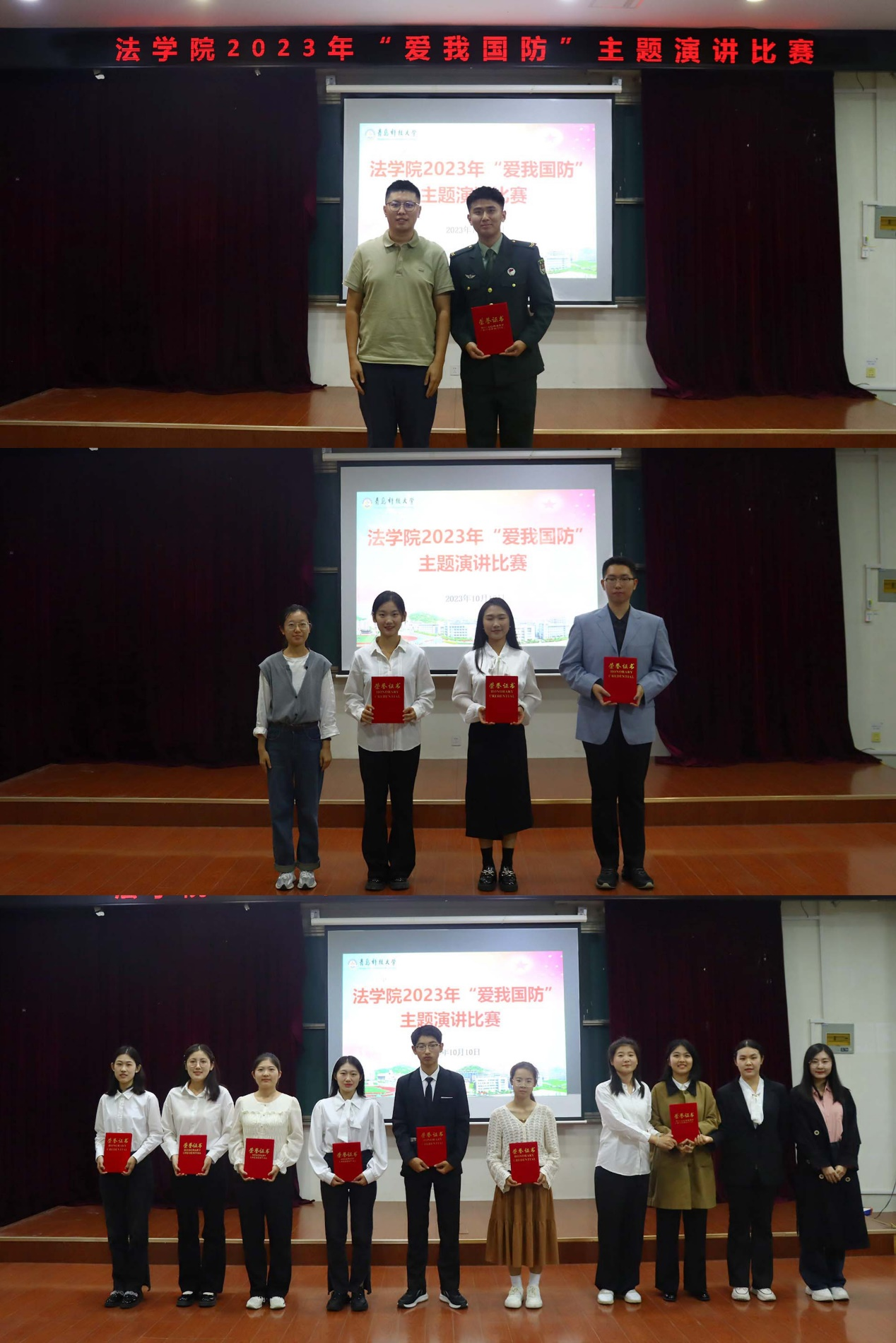 为助力在校大学生了解国防知识,掌握国防技能,激发大学生关心国防、热爱国防、建设国防、保卫国防的政治热情和行动自觉。10月10日下午,法学院于弘毅楼A201举办“踔厉奋发强国防,勇毅前行向复兴”爱我国防主题演讲比赛。法学院党总支副书记兼副院长王祥梅、学工办主任兼团委书记付继航、辅导员王梦珂和2022年校“爱我国防”演讲比赛一等奖获得者满恒宇担任评委,学院2023级新生百余人参加了活动。