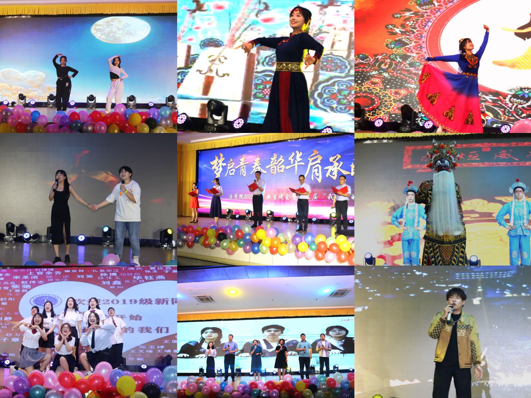 温馨的暖场视频播放后,晚会在优美的开场舞《美丽中国》的舞步中拉开序幕。刘子菲带来的歌曲《DON’TLookBack In Anger》以跳动的音符感染着在场的每一个人。歌曲《陪你度过漫长岁月》《那些年》带领现场观众回忆青春岁月燃起青春激情。朱惠邦等研究生演唱的《倔强》以不屈的青春之音燃爆全场,诠释着青春的热血,掀起了晚会的小高潮。拉丁舞《问风》激情澎湃、活力四射。教师代表的朗诵《明天,你将要远行》句句真情,为毕业生们送上了最深沉的牵挂和最美的祝福。舞蹈《年轻真好》用青春舞步展现了法学院学生阳光开朗的精神风采。白永旭等表演的京剧《将相和》将传统文化带给观众,赢得了阵阵掌声。由法学院班委们带来的朗诵《我的青春在科大》将感恩编成一束不败的鲜花,为美丽的科大校园带来无限的芬芳。崔玉蘐、韦昀表演的歌曲《经济舱》《王位》用激昂的歌声表达了对毕业生的祝福。民族舞《民族盛宴》以少数民族优美的舞蹈带我们领略了各民族歌舞的魅力。音诗画《聚是一团火,散是满天星》用合唱的形式为我们冲散离别的惆怅。毕业生们表演的《告别演唱会》翻开回忆的篇章,重温四年青春,拾梦启航,奔赴新的起点。法学院学工办全体老师演唱的《爱的代价》以美妙的音乐,悠扬的旋律,道出了对学生深沉的关爱和不舍。晚会在一曲《再见》中完美落下帷幕。