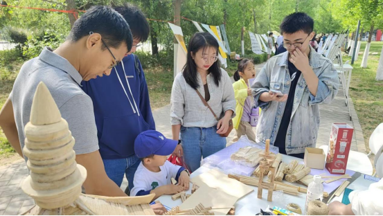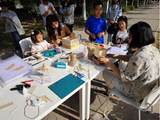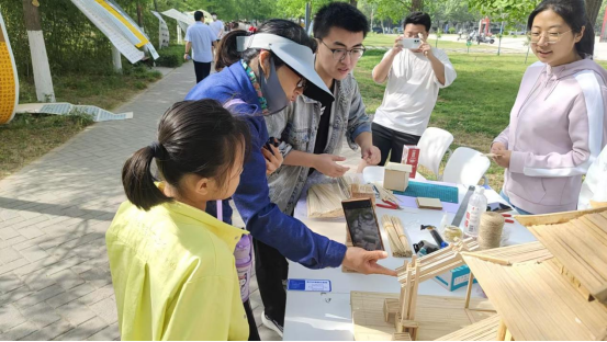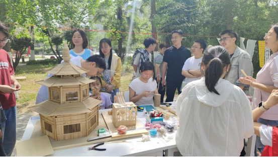 互动体验区始终人头攒动,同学们在工作人员的指导下,用木条、木板等材料搭建属于自己的建筑小品,不少同学将书法元素巧妙融入建筑设计中,创造出独具特色的"书法建筑"作品,现场欢笑声不断,展现了我校师生的创新思维和实践能力。