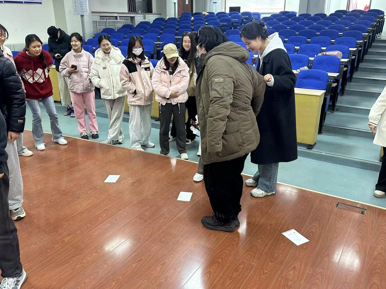 团课现场设置了丰富的趣味互动环节,“踩纸片接力”“默契协作闯关”等游戏让同学们迅速融入其中。大家结伴参与游戏,在欢声笑语中打破备考的紧张氛围,地板上的纸片成为欢乐的“打卡点”,同学们奔跑、协作的身影,让现场充满青春活力。游戏间隙,团支部还设置了压力分享角,同学们自愿交流备考中的焦虑与困惑,互相分享高效复习方法和心理调节小技巧,在彼此的鼓励中汲取前行的动力。