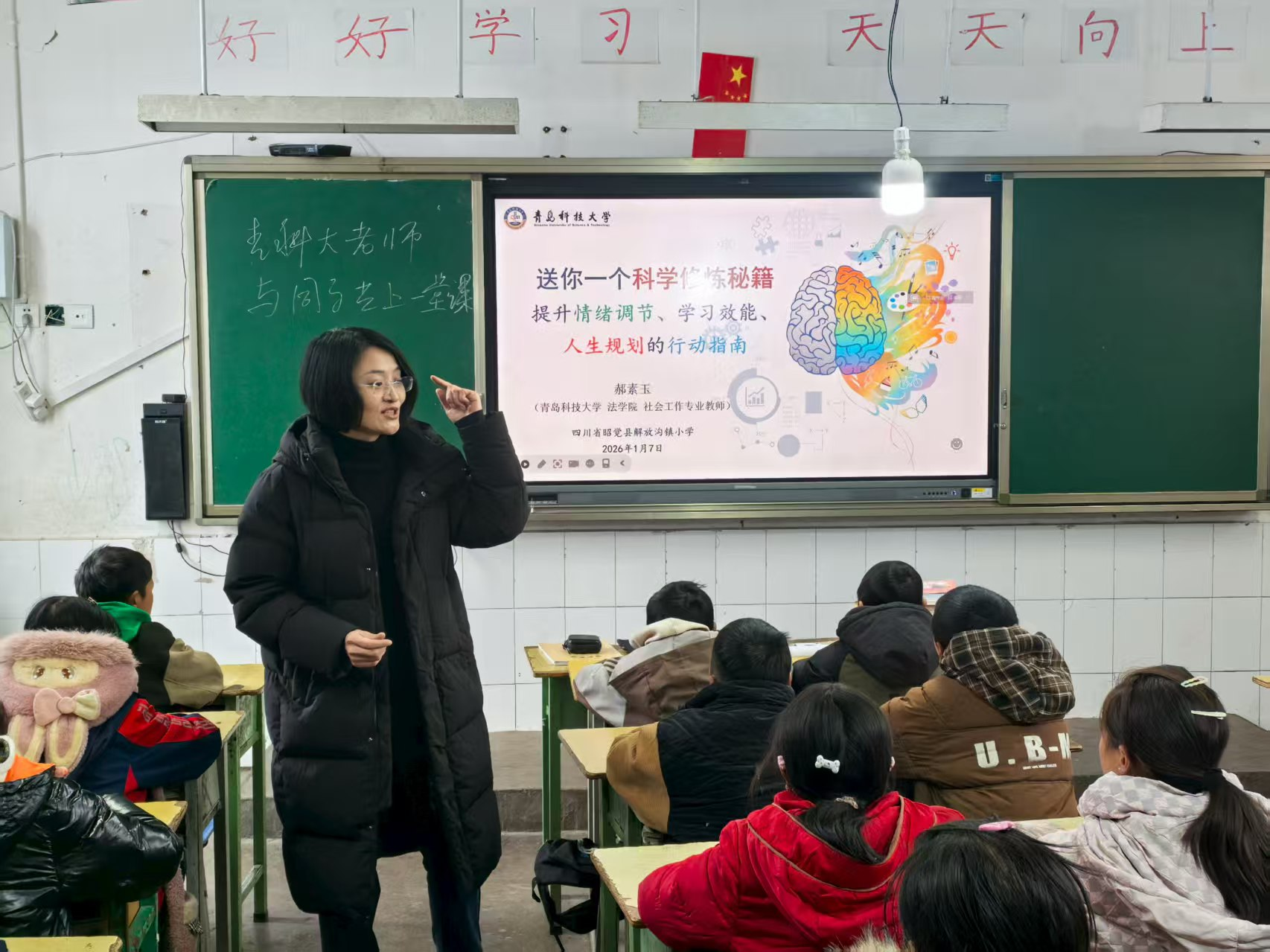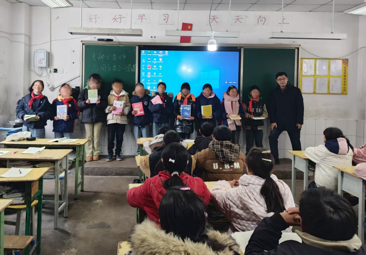 随后,曲明一行来到昭觉县解放沟镇中心小学,捐赠由山东教育集团赞助的500册精品图书,并发放由法学院筹备的500套御寒用品。并与学生们同上一堂课,郝素玉老师围绕小学生情绪调节、学习效能提升和人生规划等内容进行生动授课,为孩子们心中种下走出大山的种子。