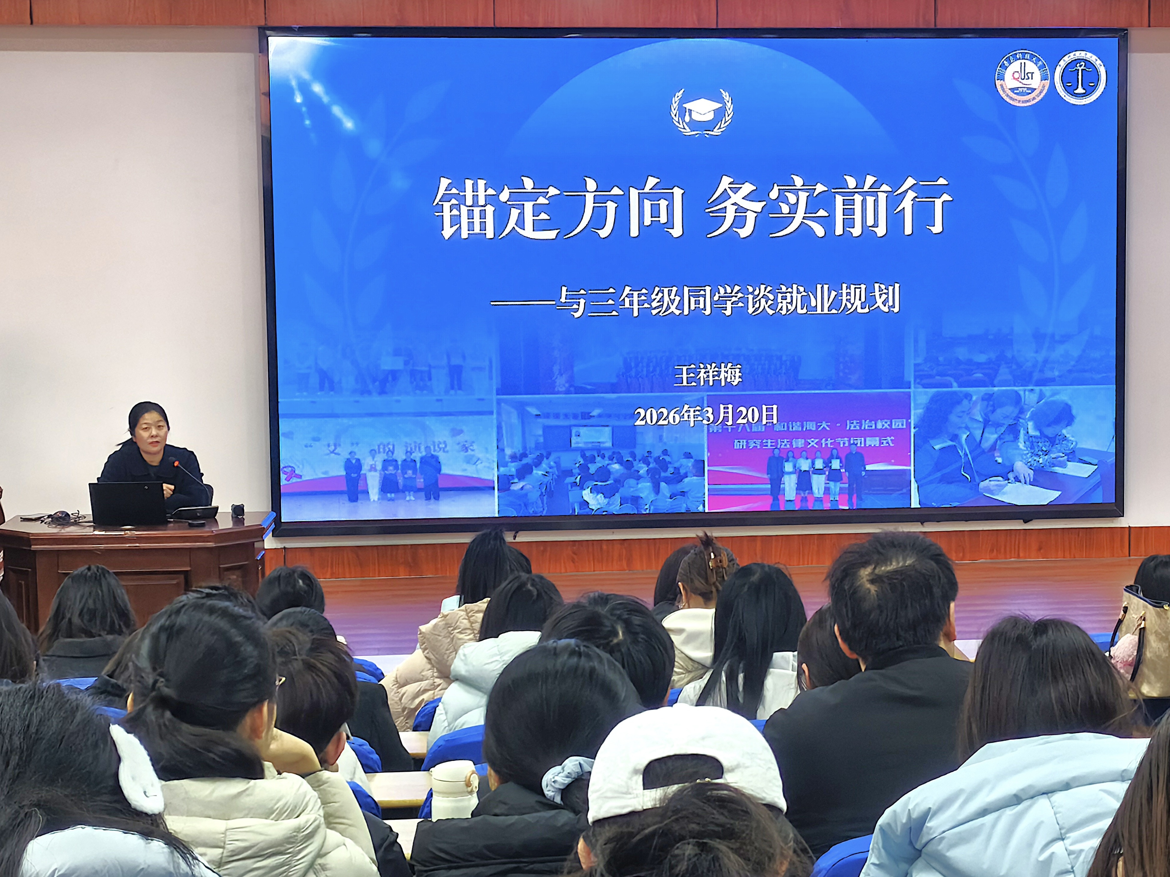为引导2023级本科生树立科学就业观,强化就业前置意识,提早做好职业规划,3月20日,法学院在模拟法庭举办“锚定方向 务实前行——与三年级同学谈就业规划”就业指导交流会。本次活动由法学院党委副书记兼副院长王祥梅主讲,全体2023级本科生参加。