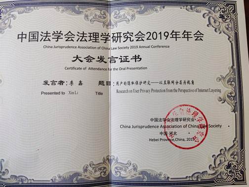 9月21-22日,由中国法学会法理学研究会主办,河北经贸大学法学院与地方法治建设研究中心承办的中国法学会法理学研究会2019年年会暨“中国法理学的新使命和新发展”学术研讨会在石家庄召开。中国法学会副会长、全国人大监察和司法委员会副主任委员、教育部法学教学指导委员会主任徐显明教授,中国法学会法理学研究会会长、中国社会科学院学部委员李林教授,河北省高级人民法院副院长王越飞,河北省人民检察院副检察长何秉群,河北省法学会副会长冯宪军等出席,来自中国人民大学、中国政法大学、西南政法大学、青岛科技大学等高校的270余位理论界与实务界专家学者和师生参加。我院副教授、副院长李鑫老师参会,并以《用户的隐私保护研究——以互联网分层为视角》为题作了大会发言。