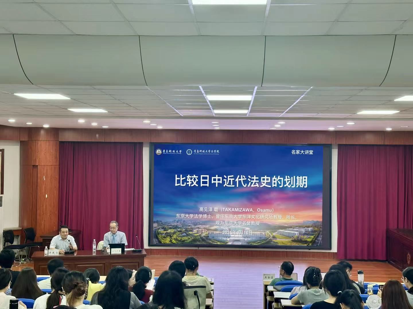 9月16日下午,法学院在弘毅楼A201模拟法庭成功举办“名家大讲堂”。本期讲堂的主题为“比较日中近代法史的划期”,东京大学法学博士、东京大学名誉教授高见泽磨受邀主讲。法学院院长王金堂教授、法学院赵玉增教授任与谈人,讲座由许庆永教授主持,法学院研究生代表参加本次讲座。