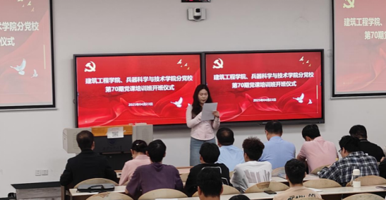 为加强入党积极分子培养教育,提高入党积极分子的政治素养和理论水平。4月23日,建筑工程学院、兵器科学与技术学院分党校于教2-102成功举办了第70期入党积极分子培训班开班式。建筑工程学院党委副书记贾建利、兵器科学与技术学院党委副书记梁伟樯、建筑工程学院学工办主任刘冬、团委书记李彬、辅导员秦亚敏、翟逸玥,建筑工程学院组织员董元浩、兵器科学与技术学院组织员陈丁参加开班式。