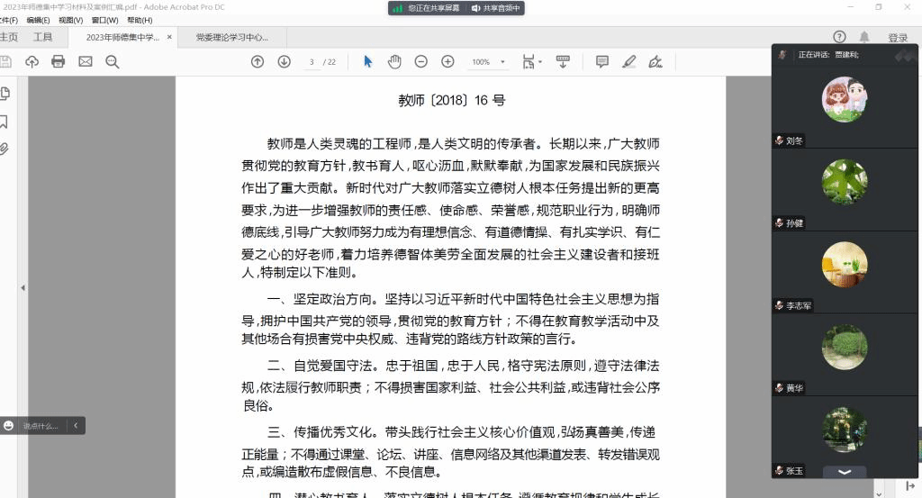 会议组织与会人员集中学习了《西安工业大学2023年师德集中学习材料及案例汇编》,深刻解读新时代高校教师职业行为十项准则,详细学习教育部公开曝光违反教师职业行为十项准则典型案例。贾建利强调教师党员要以党的二十大精神为指引加强师德师风建设,培养高素质教师队伍,弘扬尊师重教社会风尚。通过集中观看视频《清风传家丨于漪:教书育人传师表》,与会人员结合自身工作实际,纷纷表示要忠诚于党的教育事业、争做新时代“四有”好老师。
