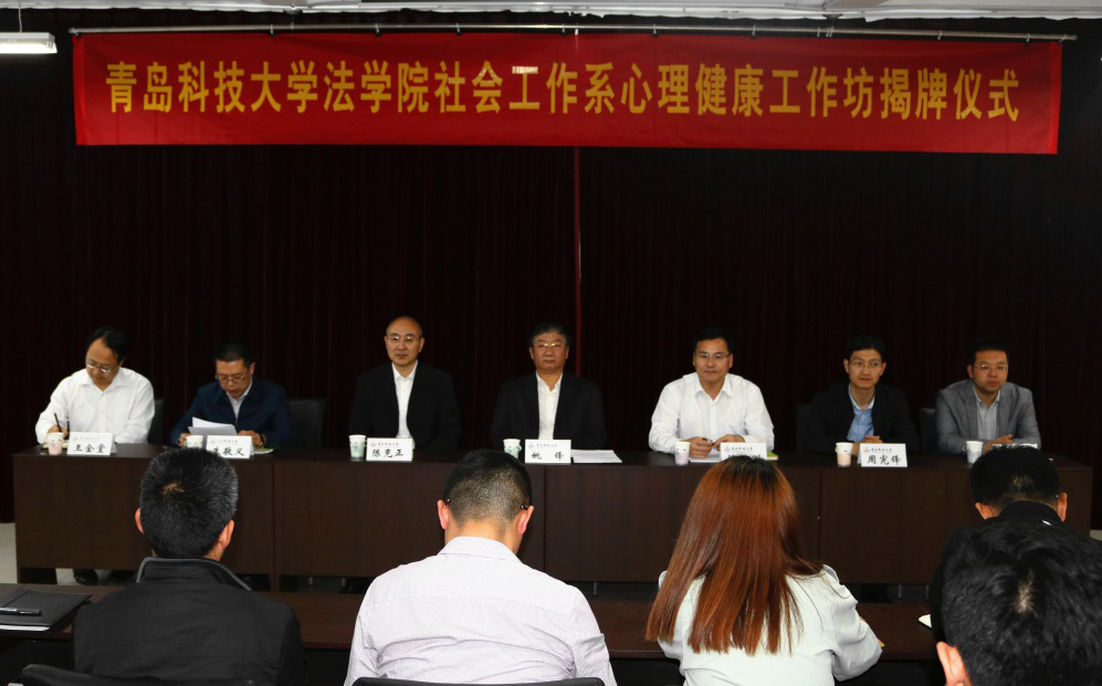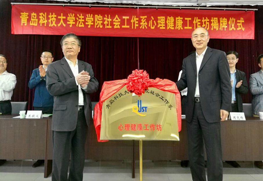 5月8日下午,青岛科技大学法学院社会工作系“心理健康工作坊”揭牌仪式在我校心理健康教育与研究中心会议室举行,纪委书记姚锋、副校长陈克正出席仪式,并为该机构揭牌。