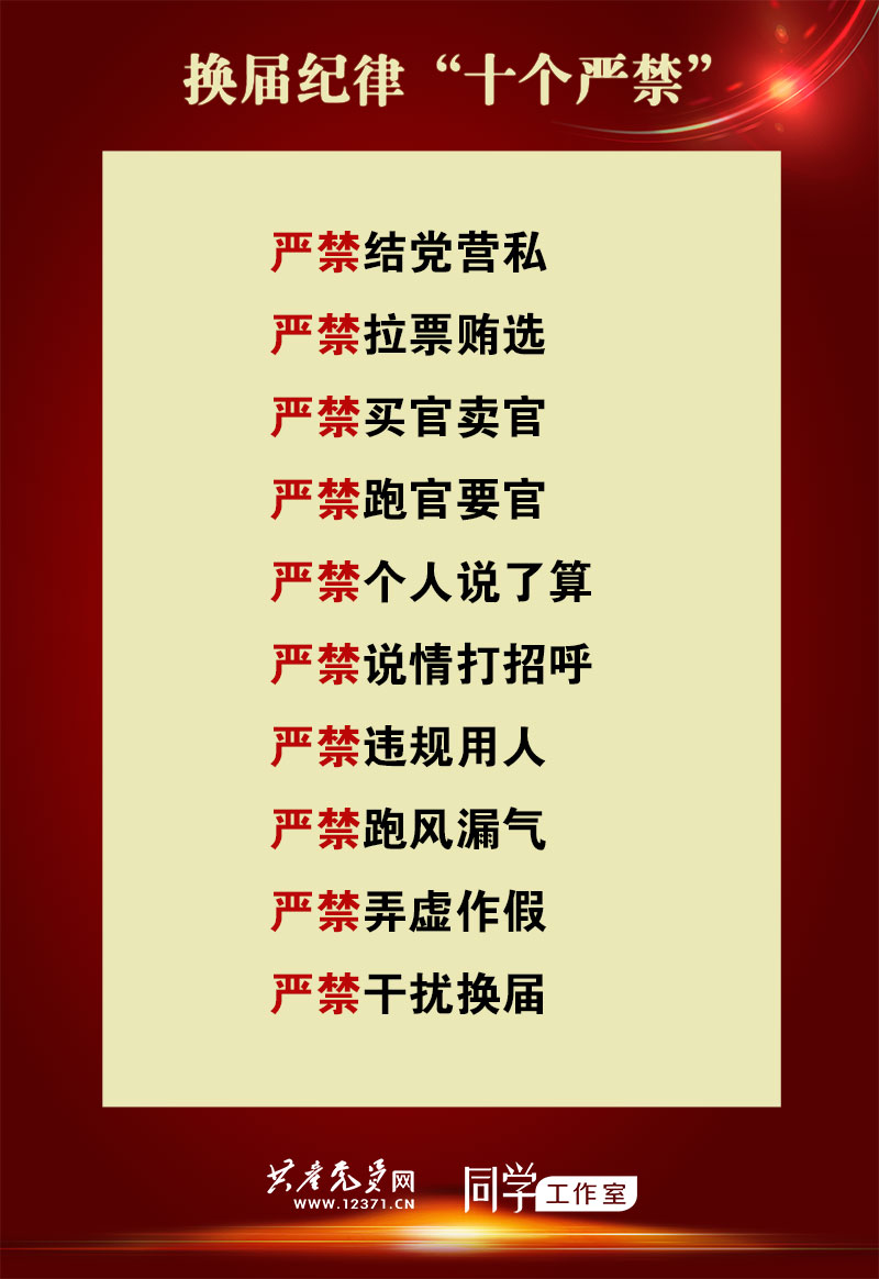 《通知》规定,要严明换届纪律,坚决维护换届工作严肃性。一是严禁结党营私,对拉帮结派、上下勾联、搞团团伙伙和小圈子的,以人划线、任人唯亲、排斥异己的,培植个人势力、结成利益集团的,一律给予党纪政务处分。二是严禁拉票贿选,对通过宴请、安排消费活动,快递邮寄、电子红包、网上转账等方式赠送礼品礼金,以及打电话、发信息、当面拜访、委托他人出面等形式,在民主推荐和选举中搞拉票、串联、助选等非组织活动的,一律排除出人选名单或者取消候选人资格,并视情节轻重给予党纪政务处分,贿选的依法处理。三是严禁买官卖官,对以谋取职务、提高职级待遇等为目的贿赂他人的,通过帮助他人谋取职务、提高职级待遇索取、收受贿赂的,一律先停职或者免职,并依规依纪依法处理。四是严禁跑官要官,对采取拉关系或者要挟等手段谋取职务、提高职级待遇的,一律不得提拔或者进一步使用,并视情节轻重给予批评教育、组织处理或者党纪政务处分。五是严禁个人说了算,对以个人决定代替党组织集体研究决定的,授意、暗示、指定提拔调整人选的,一律取消相关任用决定,并严肃追究相关领导和有关人员责任。六是严禁说情打招呼,对为他人推荐提名、提拔调整疏通关系的,违规干预下级或者原任职地区和单位干部选拔任用的,一律作为领导干部违规插手干预重大事项的情形记录在案,并视情节轻重给予批评教育、组织处理或者党纪政务处分。七是严禁违规用人,对借换届之机突击提拔调整干部、超职数配备干部、违反规定程序选拔任用干部的,一律宣布无效,并对相关人员依规依纪进行处理。八是严禁跑风漏气,对泄露、扩散换届人事安排等保密信息的,一律追究相关人员责任。九是严禁弄虚作假,对篡改、伪造干部人事档案材料的,在换届考察工作中隐瞒或者歪曲事实真相的,一律予以纠正,并视情节轻重对相关人员给予组织处理或者党纪政务处分。十是严禁干扰换届,对境内外敌对势力搅扰破坏换届的,严加防范、坚决打击;对黑恶势力、家族势力、宗教势力干扰影响换届选举的,违规接受境外机构、组织、个人提供资助或者培训的,以威胁、欺骗、利诱等手段妨害他人自由行使选举权的,造谣诽谤、诬告陷害或者打击报复他人的,一律严厉查处,涉嫌违法犯罪的依法追究法律责任。