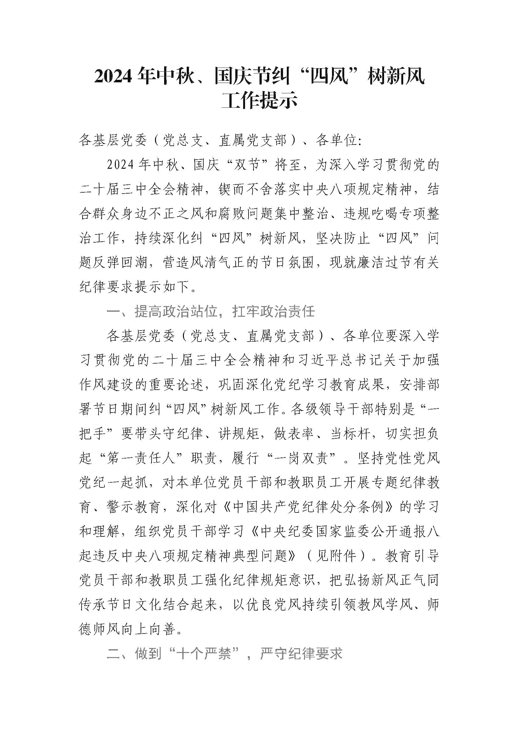 2024年中秋、国庆节纠“四风”树新风工作提示