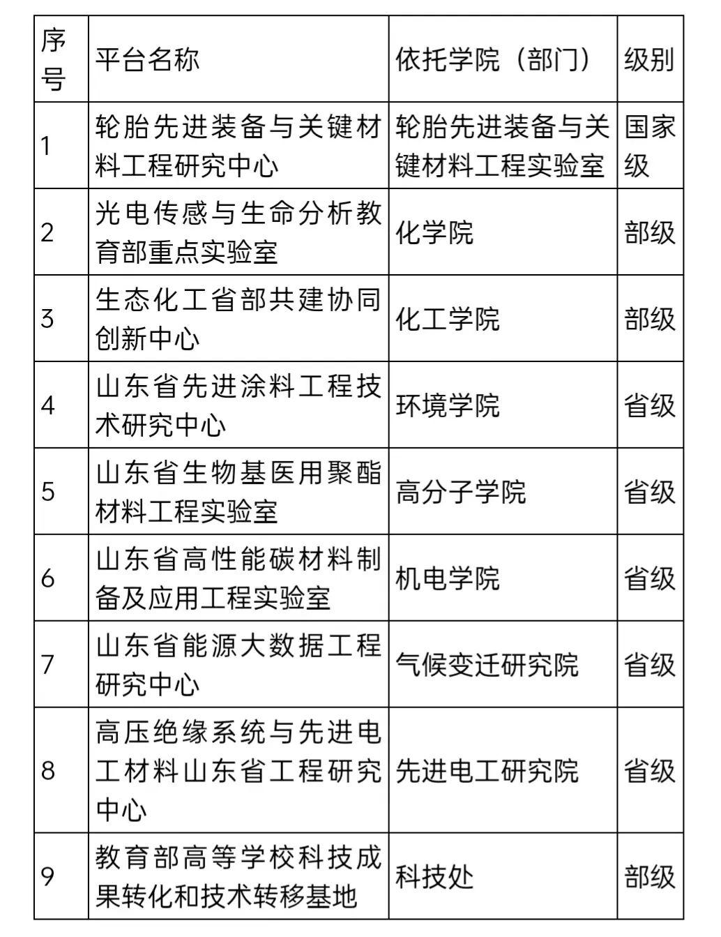 第十次党代会以来,学校新增省部级以上科研平台9个,市厅级科研平台26个,行业重点实验室1个(表1)。2020年生态化工省部共建协同创新中心获批成立,2021年轮胎先进装备与关键材料国家工程研究中心获批新序列,标志着我校国家级序列平台建设取得新成效。化学、化工和材料学三个学科均实现了国家级平台的全覆盖,平台建设有效支撑了学校的学科建设。